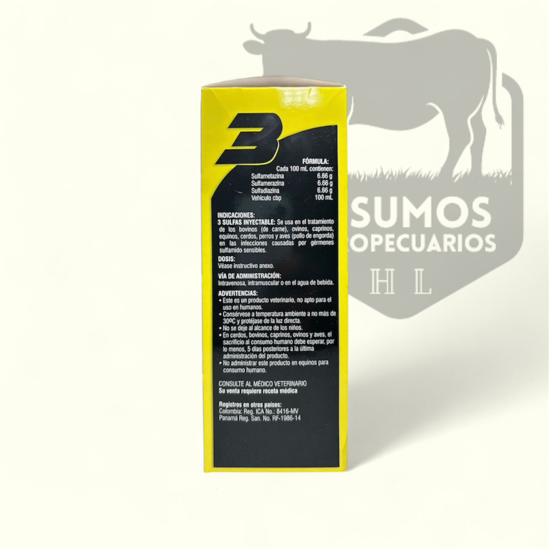 3 SULFAS es una solución inyectable elaborada con Sulfametazina, Sulfamerazina y Sulfadiazina, cuya combinación antibiótica presenta una mayor solubilidad, menor toxicidad renal y mayor espectro de acción antibacteriano actuando contra bacterias grampositivas y gramnegativas que causan enfermedades digestivas, respiratorias, genitourinarias, de la glándula mamaria, del aparato locomotor y septicémicas en bovinos, equinos, ovinos, cerdos, aves y perros.