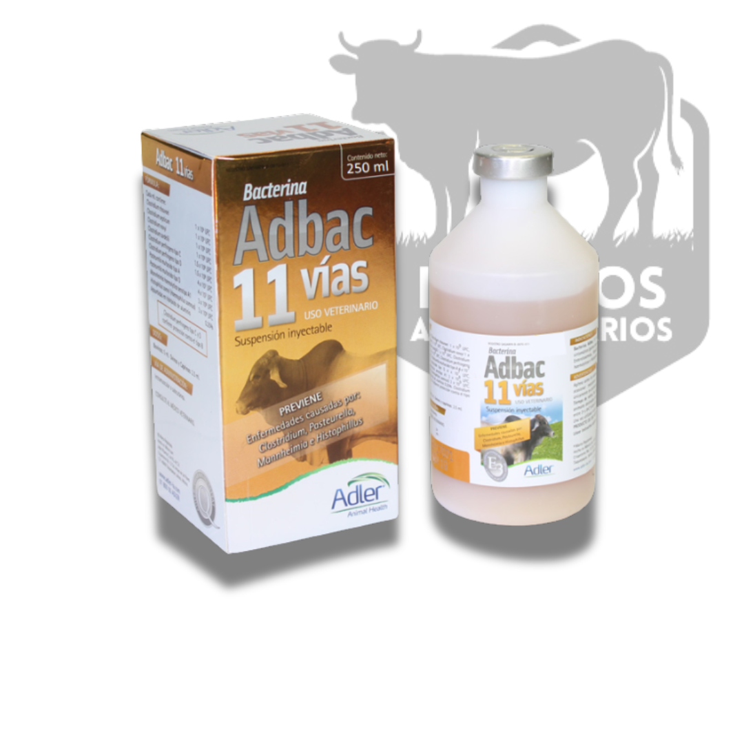 INDICACIONES: Adbac 11 vías está indicada para la prevención del Carbón sintomático (Pierna negra), Edema maligno, Hepatitis necrótica infecciosa, Enterotoxemias, Miositis, Pasteurelosis, Infecciones por Mannheimia haemolytica e Histophilus somni en Bovinos, Caprinos y Ovinos.