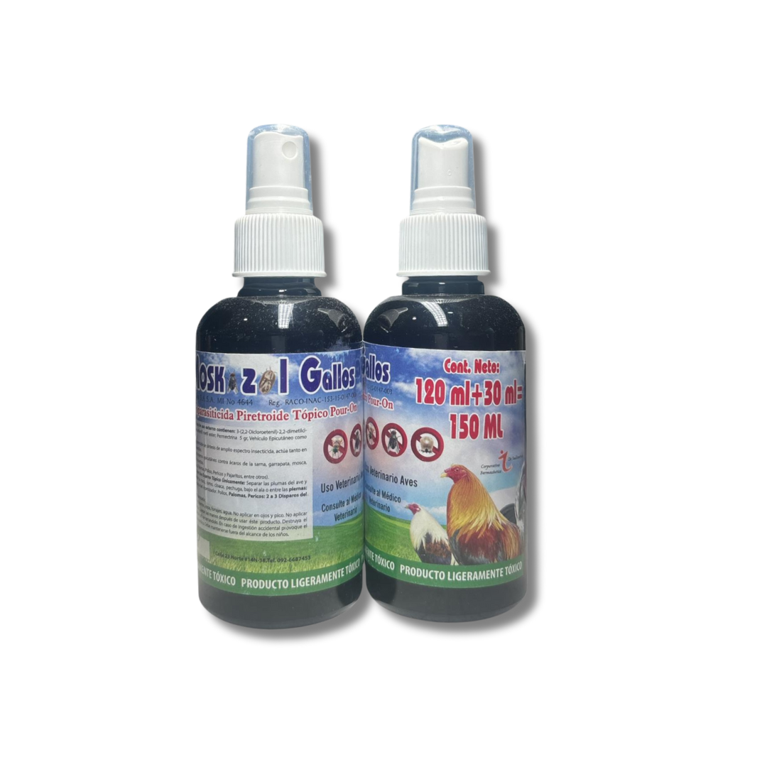 Insecticida para uso externo epicutáneo contra ácaros de la sarna; garrapata; mosca doméstica del establo, del cuerno o paleta; mosquito: piojo; pulga y tábano entre otros insectos, exclusivo para Gallos.