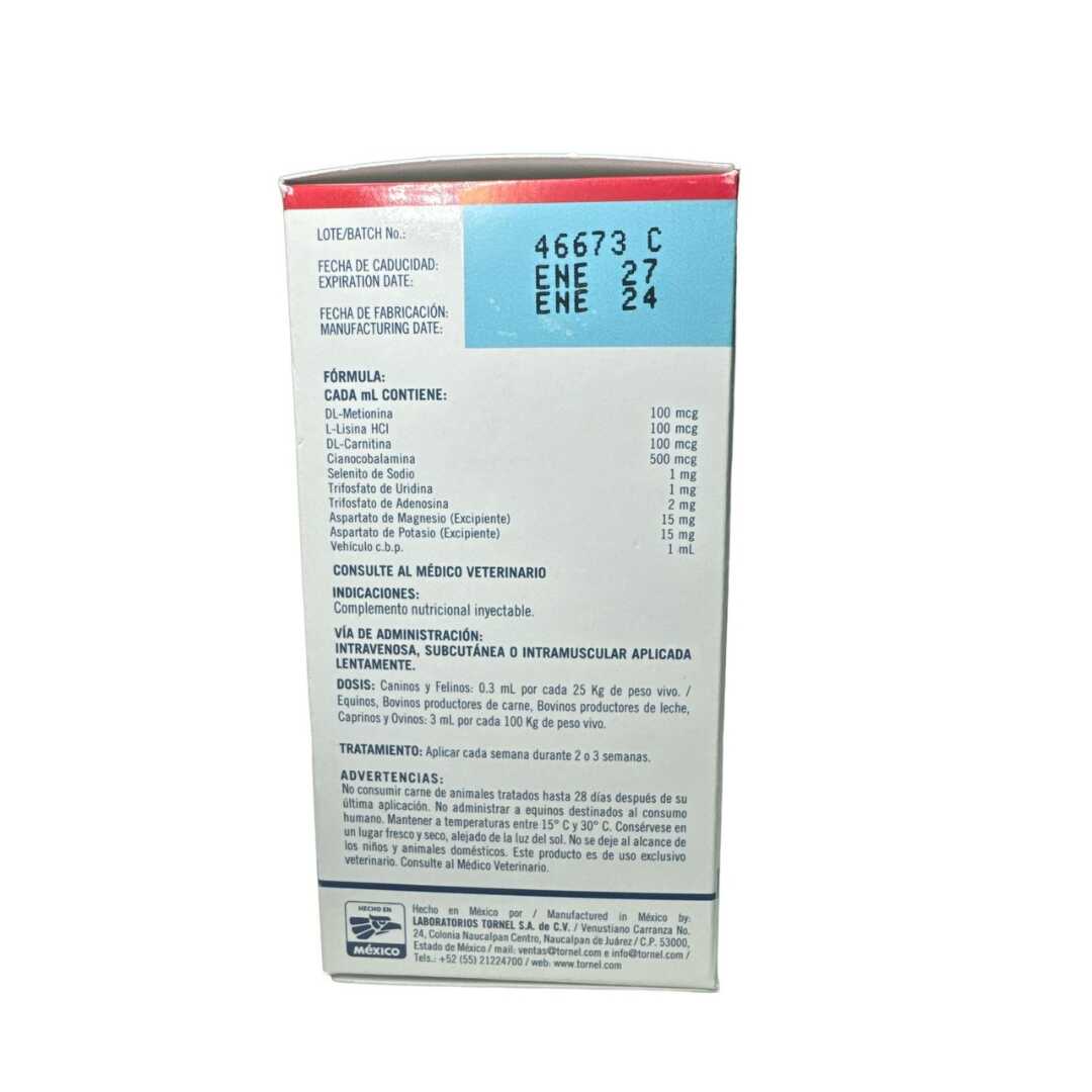 DL-metionina 100 mcg L-lisina-HCl 100 mcg DL-carnitina 100 mcg Cianocobalamina 500 mcg Selenito de sodio 1 mg Trifosfato de uridina 1 mg Trifosfato de adenosina 2 mg Aspartato de magnesio 15 mg Aspartato de potasio 15 mg Vehículo, c.b.p. 1 Ml